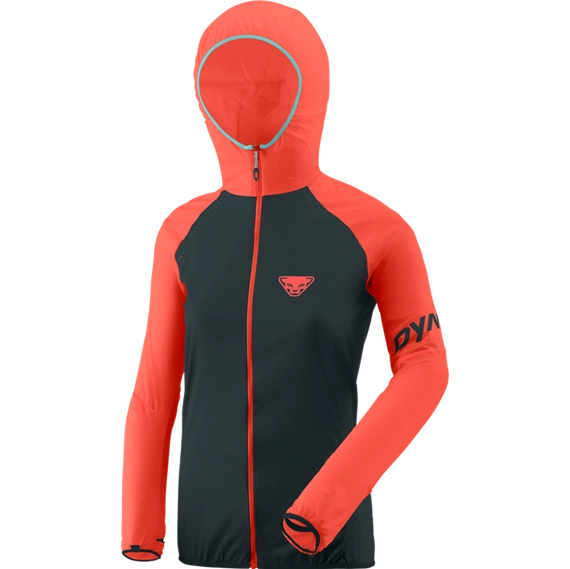 Zastosowany ekstremalnie lekki materiał Dynashell Ultralight jest wodo- i wiatroszczelny, a przy niezwykle miły w dotyku. Mankiety z otworami na kciuk utrzymują kurtkę blisko ciała i chronią dłonie w wietrznych i chłodniejszych warunkach. Tył kurtki wykonany został częściowo z materiału o strukturze siateczki – podnosi to oddychalność i poprawia cyrkulację powietrza przy plecach, dzięki czemu noszenie plecaka podczas intensywnego wysiłku jest o wiele bardziej komfortowe. Dopasowany kaptur można w każdej chwili zwinąć i przypiąć, co unieruchamia go na czas biegania. Kurtka kompresuje się do zintegrowanej w kapturze kieszeni, a minimalny rozmiar, jaki uzyskuje po spakowaniu sprawi, że bez problemu zmieści się w każdym plecaku.