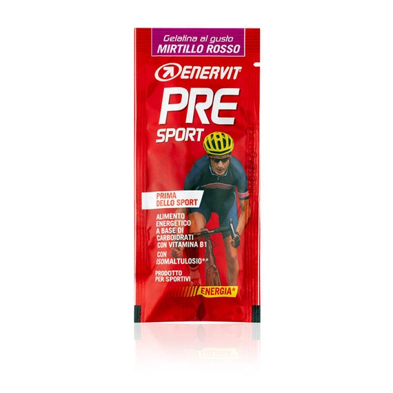 Enervit Sport Pre Sport to produkt z wysoką zawartością węglowodanów w formie galaretki z dodatkiem witaminy B1. Enervit Pre Sport to produkt, który należy spożywać przed rozpoczęciem aktywności fizycznej. Źródłem 30% węglowodanów jest izomaltuloza – dzięki czemu produkt charakteryzuje się niskim indeksem glikemicznym, zapewniającym powolny i stopniowy wzrost stężenia glukozy we krwi. Galaretka Enervit Sport Pre Sport jest beztłuszczowa.