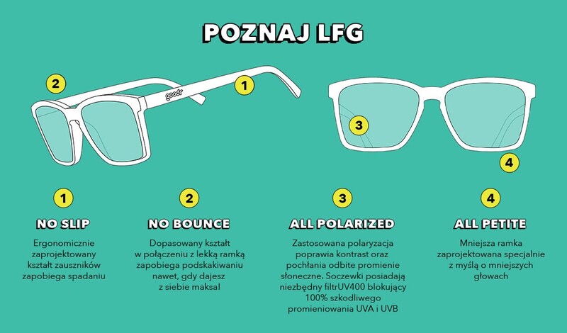 W czym tkwi sukces tego producenta? Odpowiedź jest prosta jak życie na słonecznej Florydzie! Klasyczny styl, pewne dopasowanie do twarzy, lekkość i ten modny look - zbierając wszystkie te składniki w całość otrzymujesz najlepszą receptę na doskonały wygląd zarówno podczas biegowego/kolarskiego treningu, jak i niezobowiązujących spotkań w gronie przyjaciół. Poza tym, nie oszukujmy się, to nie jest marynarka, żeby płacić za to 1500 papieru. Goodr nie wymyśla też na nowo koła i nie tworzy produktów naszpikowanych dziwnymi technologiami z kosmosu, które nie niosą za sobą żadnej treści. Chcesz praktyczne okulary bez przesadnych kombinacji? Et voila!