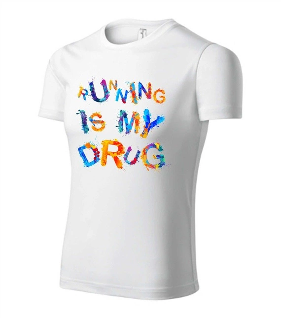 Lekka koszulka unisex z szybkoschnącego materiału dla biegaczy z nadrukiem RUNNING IS MY DRUG COLOR. Znakomita na codzienne treningi i na starty.